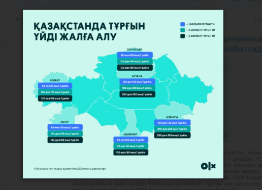 OLX аналитикалық қызметінің мәліметінше, 2024 жылдың қаңтарынан жылдың соңына дейін Қазақстанда тұрғын үйді жалға алу бағасы орташа есеппен қалаға байланысты 10–15%-ға өсті. Бағаның ең жоғары өсуі Алматы, Астана, Шымкент, Ақтау, Атырау, Петропавл және басқа да бірнеше қалаларда тіркелді.