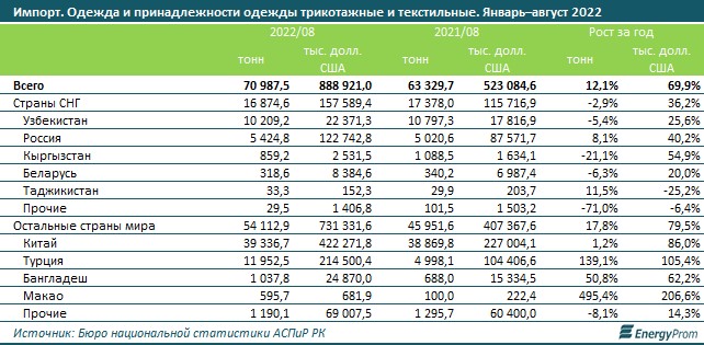 За январь–август текущего года импорт трикотажной и текстильной одежды в РК составил 71 тыс. тонн на сумму 888,9 млн долл. США.