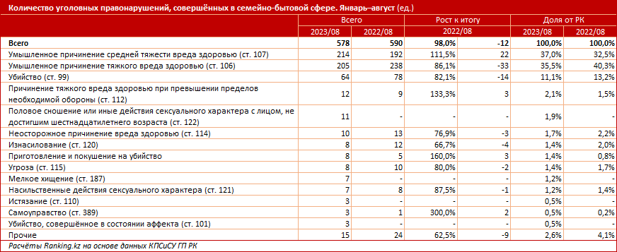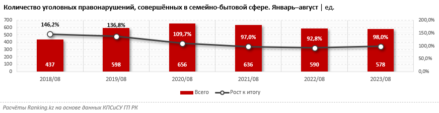 За январь–август текущего года в Казахстане было совершено 578 уголовных правонарушений в семейно-бытовой сфере — на 2% меньше, чем годом ранее, сообщает аналитическая служба Ranking. Для справки: в аналогичном периоде 2022-го совершили 590 таких правонарушений, минус 7,2% за год.