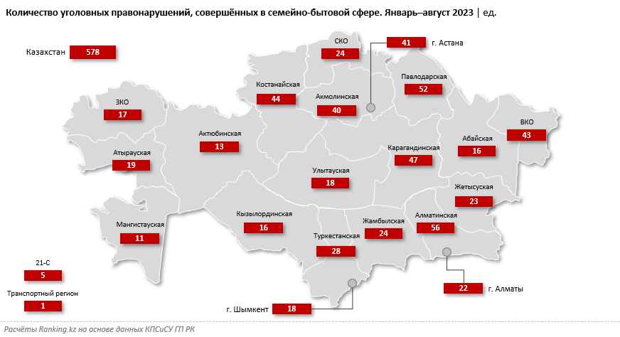 В региональном разрезе больше всего уголовных правонарушений в семейно-бытовой сфере совершили в Алматинской области: 56 случаев за восемь месяцев — на 13,8% меньше, чем годом ранее.