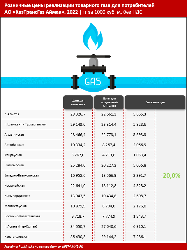 Мысалы: Қарағанды облысында 1 текше метрдің бағасы. м газ жалпы халық үшін 36,4 теңгені құрайды, ал АӘК және ЖЖҚ алушылар үшін бар болғаны 29,1 теңге, яғни 7,3 теңгеге аз. Өз кезегінде атаулы әлеуметтік көмек алушылардың басым бөлігі шоғырланған өңірлерде Түркістан облысы мен Шымкент қаласында 1 текше метр. м газ жалпы халық үшін 29,1 теңге тұрады, ал тікелей АӘК және ЖПҚ алушылар үшін бар болғаны 23,2 теңге, яғни 5,8 теңгеге төмен.