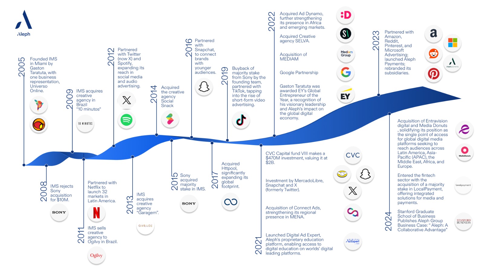 От скромного стартапа в Майами в 2005 году до мирового лидера в сфере digital-рекламы — Aleph последовательно бросал вызов существующему положению вещей, преодолевая барьеры и создавая возможности на более чем 150 рынках по всему миру, с более чем 60 эксклюзивными партнерствами, обслуживая более 15 000 рекламодателей по всему миру и имея свыше 1 500 сотрудников по всему миру.