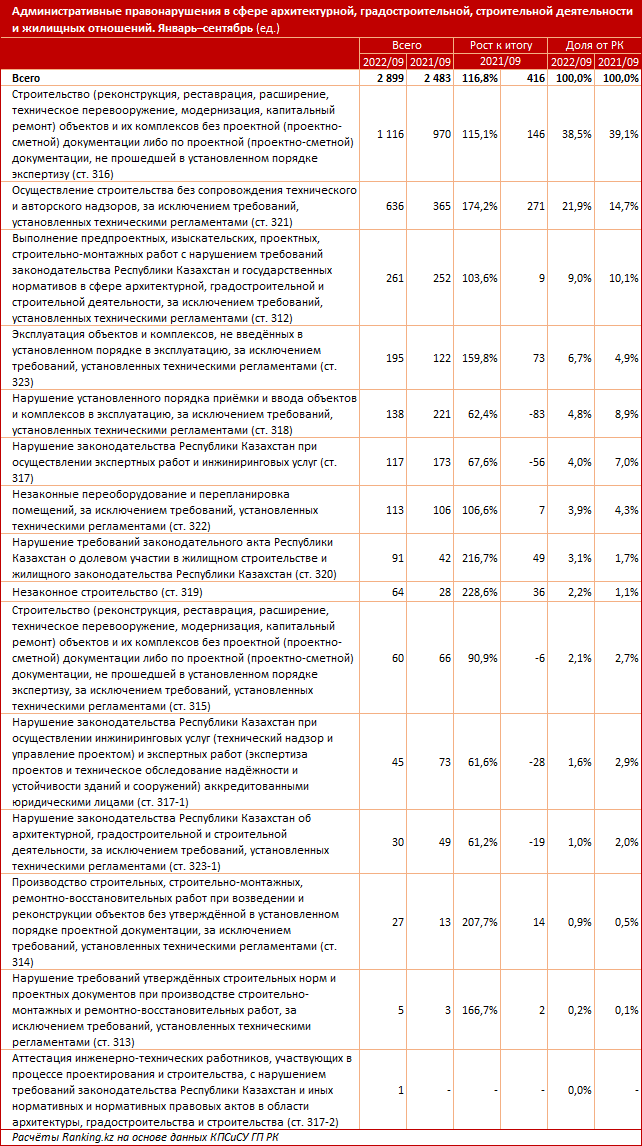За январь–сентябрь текущего года в стране зарегистрировали 2,9 тыс. административных правонарушений в сфере архитектурной, градостроительной, строительной деятельности и жилищных отношений — сразу на 16,8% больше, чем годом ранее, сообщает Ranking.kz.