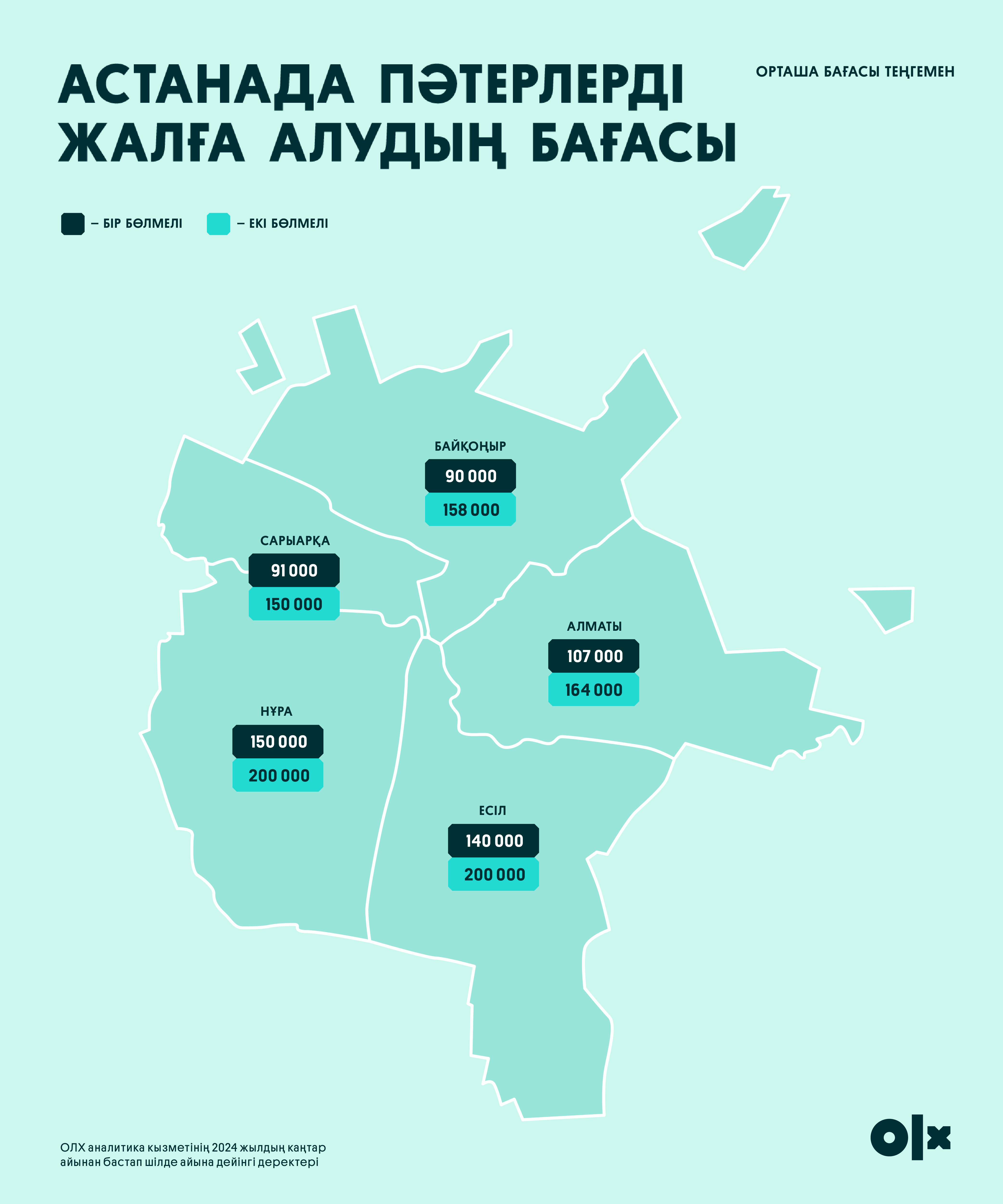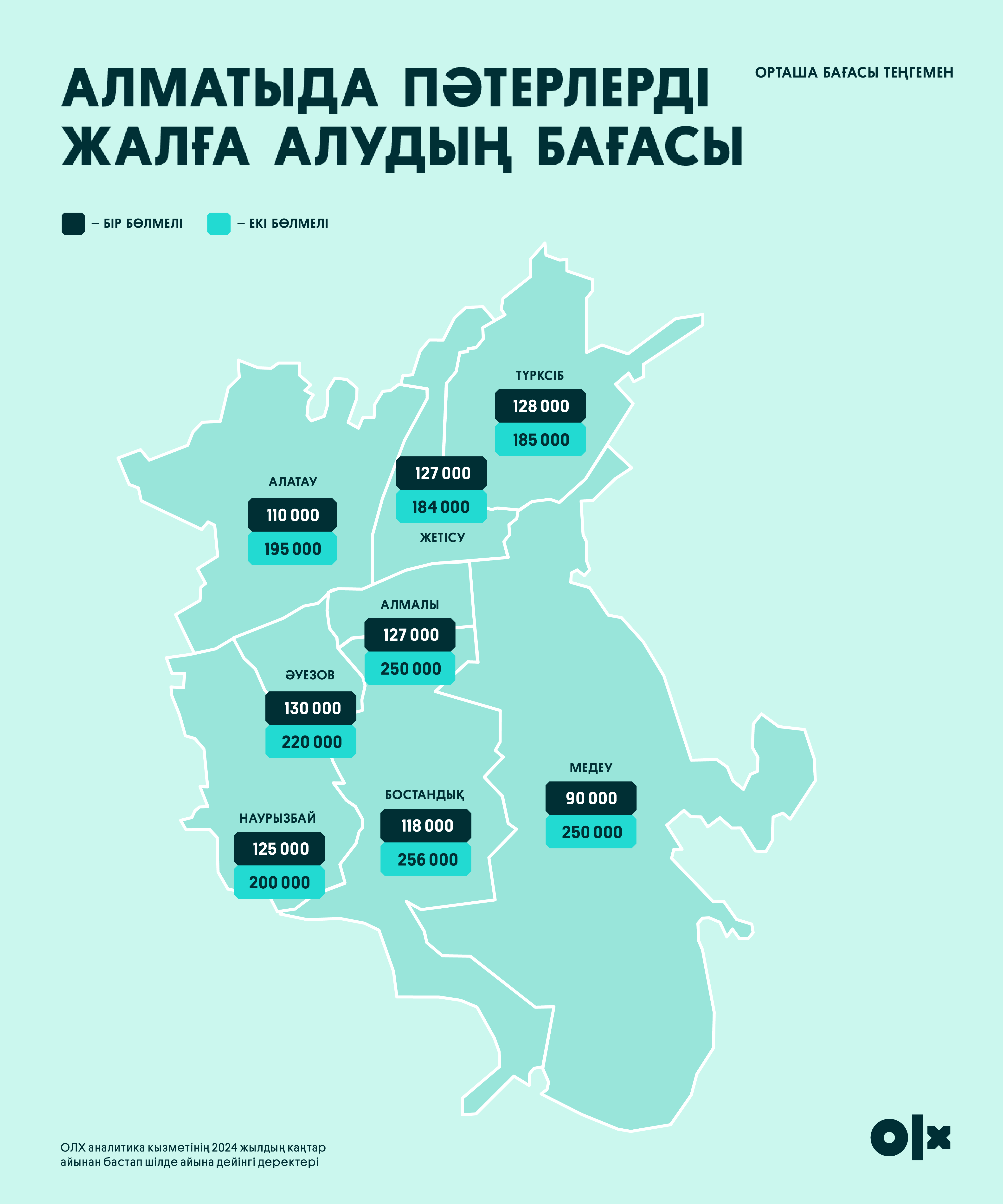 OLX.kz талдау қызметінің мәліметтері бойынша, Алматыда қазіргі уақытта бір бөлмелі пәтерлерді жалға алу туралы 8 583 ұсыныс және екі бөлмелі пәтерлерге арналған 4 791 ұсыныс бар.