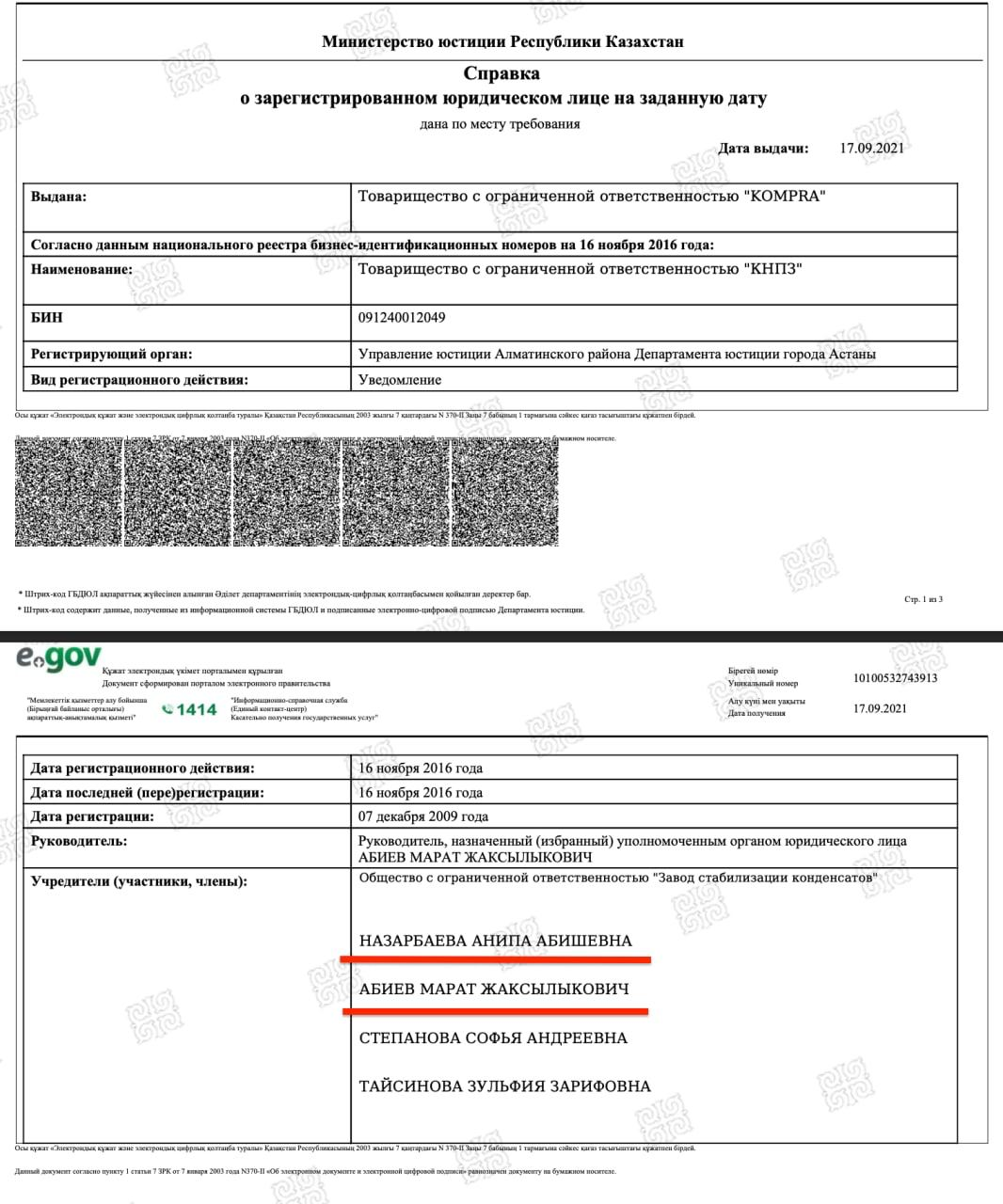 Сонымен қатар, интернетте 2021 жылғы 17 қыркүйекте тіркелген заңды тұлға туралы белгілі бір «анықтама» тарады, онда «KNPZ» ЖШС құрылтайшыларының арасында Әбиевпен бірге бұрынғы президенттің әпкесі Әнипа Назарбаева да бар.