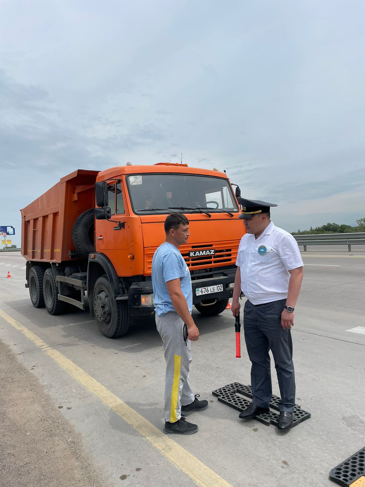 «Жол активтерінің ұлттық сапа орталығы» Алматы қалалық филиалының қызметкерлері Көліктік бақылау инспекциясымен бірлесіп ауыр жүк көліктерін тексеруді жалғастыруда.