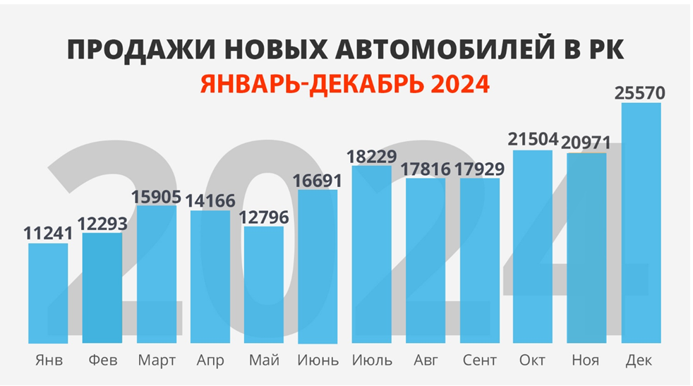 По данным «Қазақстанның Автокөлік Одағы» (ҚАО) в 2024 году официальными дилерами реализовано 205 111 новых автомобилей (+3,2%). Что сопоставимо с результатами 2023 года, с его бурным ростом продаж в четвертом квартале. В декабре продано 25 570 авто на 8,6% больше, чем в рекордном декабре 2023 года. Продажи в 2024 году — это лучший результат за всю историю казахстанского авторитейла.