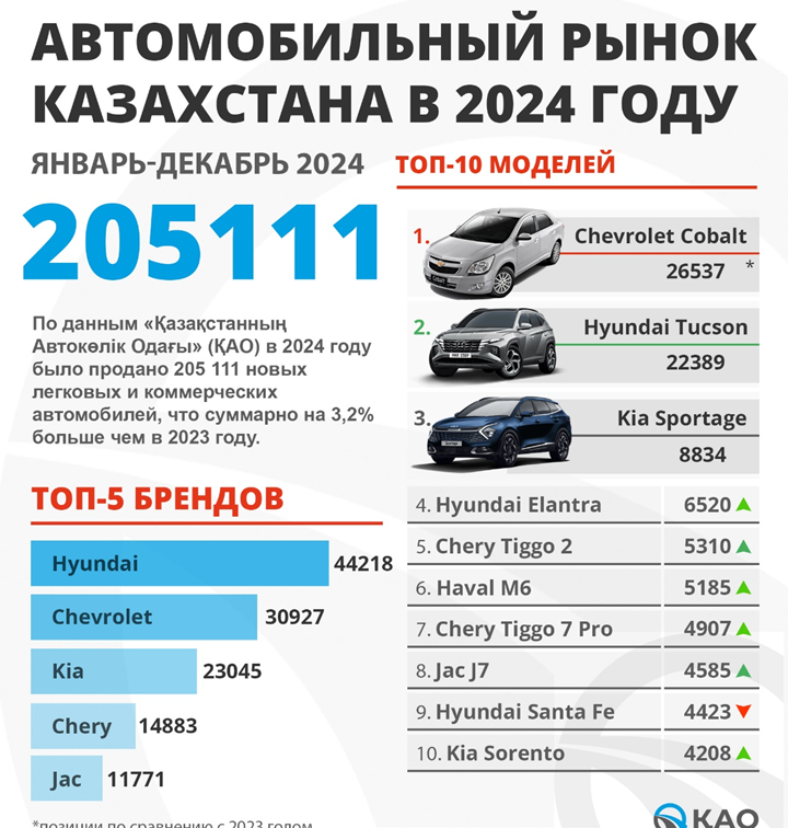 По итогам продаж в 2024 году, в десятке самых популярных брендов в РК второй год подряд лидирует Hyundai (доля рынка 21,6%). В январе-декабре было продано 44 218 автомобилей Hyundai в основной массе произведенных в Алматы (-5,4% к результатам прошлого года). Вторую строчку занимает костанайский Chevrolet – 30 927 ед. (-32,5%). Kia с результатом 23 045 (-9,6%) на третьем месте. Китайский бренд Chery застолбил за собой четвертое место (14 883 ед.; +21,7%). Jac из Костаная по итогам года переместился с седьмого на пятое место (11 771 ед.; +56,7%). Toyota занимает шестое место – 11 045 ед. (+2,7%). На седьмом месте автомобили Haval (10 983 ед.; +45,3%). ТОП-10 наиболее успешных брендов замыкают: Jetour (9 507 ед.; +141,9%), Changan (8 510 ед.; +39,8%) и Geely (8 252 ед.; +126,5%).