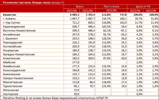 Наименьший объём официального ритейла был зафиксирован в новообразованной Улытауской области: всего 39 млрд тг. Далее идут Жетысуская и Туркестанская области.