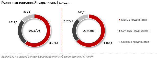 В разрезе размерности предприятий наибольший объём ритейла пришёлся на малые компании: 3,6 трлн тг — на 6,9% больше, чем годом ранее.