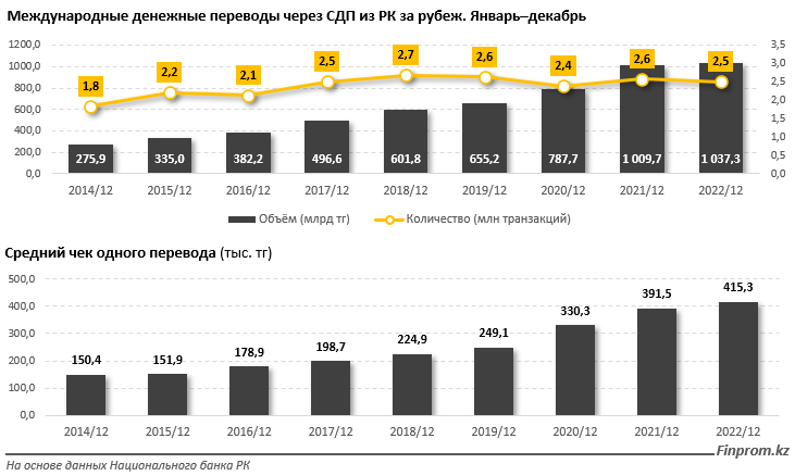 Количество транзакций при этом сократилось с 2,6 млн до 2,5 млн, что увеличило средний чек одного перевода за рубеж с 391,5 тыс. тг в 2021 году до 415,3 тыс. тг в 2022-м.