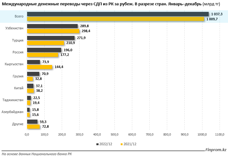 Более половины всех переводов из РК было отправлено в Узбекистан и Турцию. В Узбекистан отправили 289,8 млрд тг (на 2,9% меньше, чем за январь–декабрь 2021 года), а в Турцию — 271,9 млрд тг (на 28,9% больше по сравнению с 2021 годом). Значительный объём средств был отправлен также в Россию: 196 млрд тг, что на 10,6% больше, чем в 2021 году.