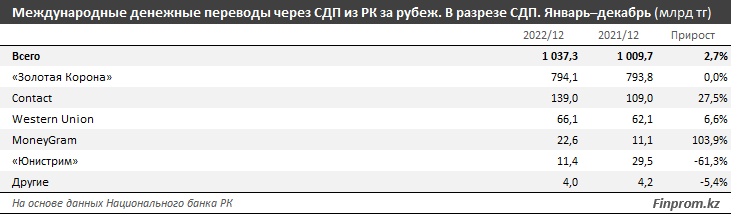 Среди систем денежных переводов 76,6% всех средств, отправленных из РК за рубеж за январь–декабрь 2022 года, пришлось лишь на российскую систему «Золотая Корона»: 794,1 млрд тг, при этом по сравнению с 2021 годом объём практически не изменился.