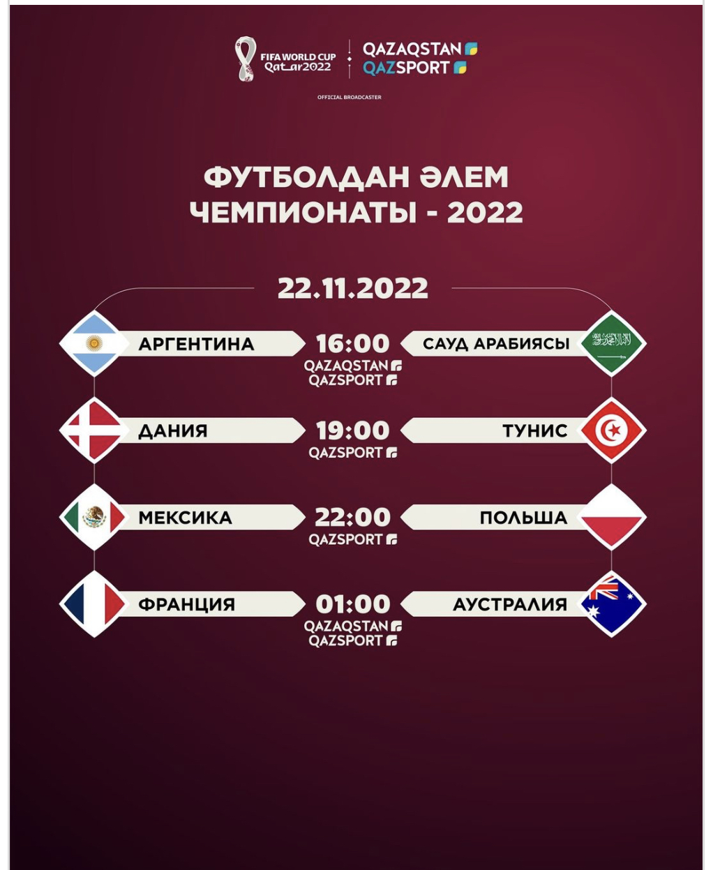Айта кетейік, футболдан әлем чемпионаты 20 қараша мен 18 желтоқсан аралығында Катарда өтеді.