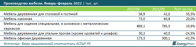 В натуральном выражении значительно выросло производство деревянной мебели для столовой и гостиной (56,9 тыс. изделий, годовой рост — на 35,5%), а также кухонной мебели (73 тыс. изделий, плюс 20%). Выпуск стульев, табуретов и прочей мебели для сидения с металлическим каркасом вырос на 10,6% за год, до 869,1 тыс. изделий.
