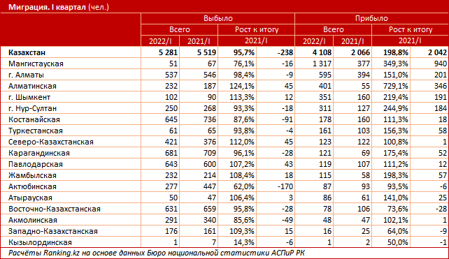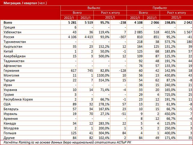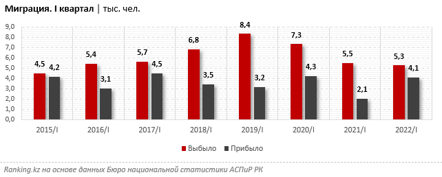 В первом квартале текущего года в страну прибыло 4,1 тыс. человек — сразу в 2 раза больше, чем годом ранее. В то же время выбыло 5,3 тыс. человек — на 4,3% меньше, чем годом ранее. Сокращение численности выбывших из РК наблюдается третий год подряд, сообщает аналитическая служба Ranking.