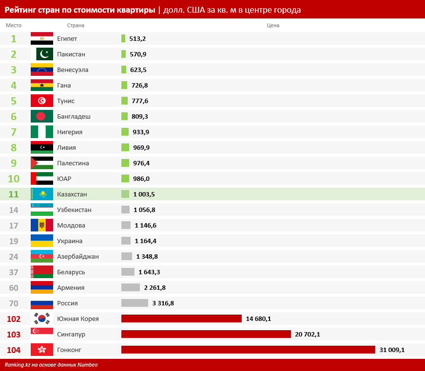 Рейтинг составлен исходя из соотношения стоимости квартиры и среднего годового дохода семьи, зависящего от «чистых» зарплат. Для сравнения: Узбекистан занял в этом рейтинге лишь 75-е место, Россия — 88-е, Беларусь — 90-е. Открывают рейтинг такие нефтегазовые страны, как Саудовская Аравия и ОАЭ, замыкает Сирия.