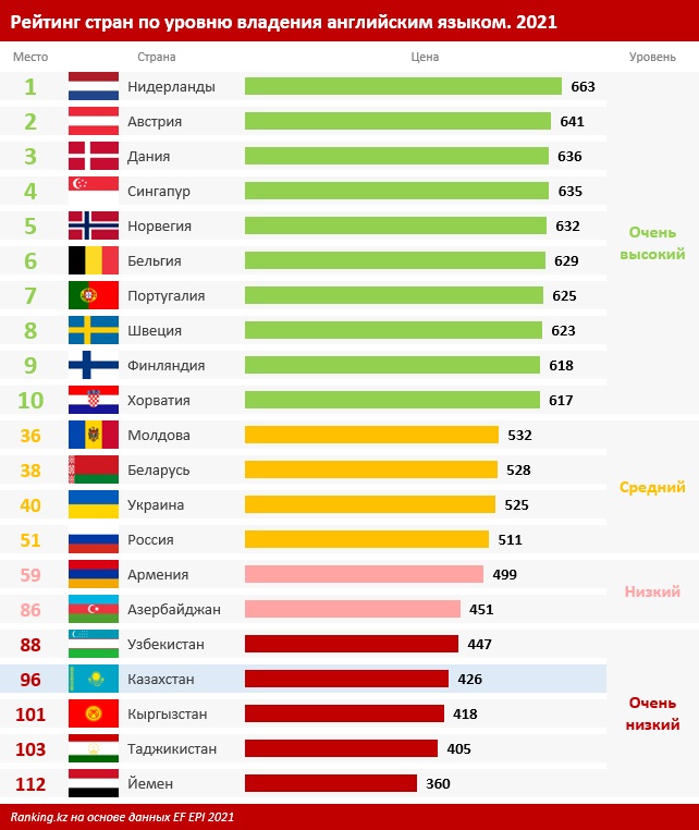 Среди государств СНГ к странам со средним уровнем владения английским языком отнесли Молдову, Беларусь, Украину и Россию, к странам с низким уровнем — Армению и Азербайджан. Остальные страны СНГ показали очень низкий уровень владения английским языком, среди них выше РК оказался Узбекистан, ниже — Кыргызстан и Таджикистан.