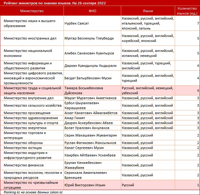 Лидирующую строчку занял министр науки и высшего образования Нурбек Саясат. Министр владеет семью языками — казахским, русским, английским, итальянским, турецким, японским и латынью.