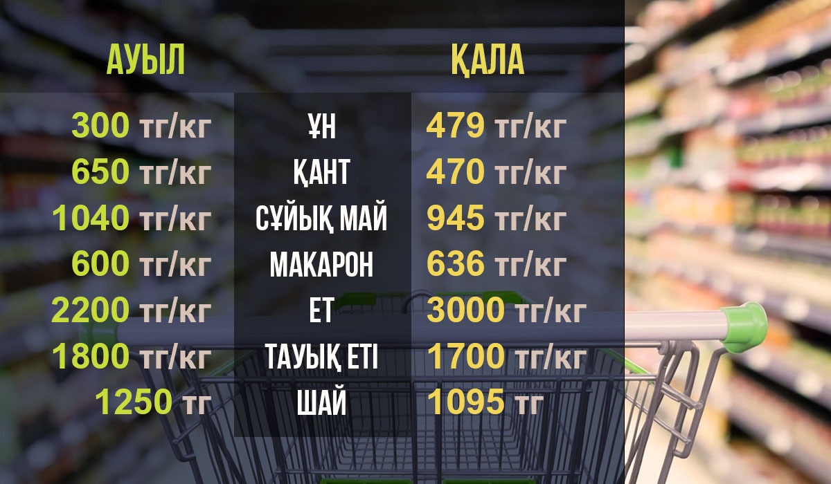 «Ауылда көбіне азық-түлікті молынан алып отырамыз. Мысалы, бір қап ұнның қазіргі бағасы – 15 мың теңге. Сонда 1 келі ұн – 300 теңге болып тұр. Қанттың бағасы әр түрлі, біздің ауылда – 650 теңге.  1 келі макарон 600 теңгеден. 5 литрлік сұйық май — 5200 тг. Кәмпиттің ең төменгі бағасы 2800-ден жоғары.
