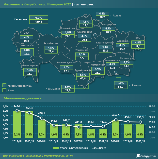 В третьем квартале 2022 года численность безработного населения составила 450,3 тыс. человек — на 0,1% меньше по сравнению с аналогичным периодом 2021-го. Численность безработных в РК сокращается второй год подряд, при этом по сравнению с третьим кварталом 2019 года показатель всё ещё выше на 1,9%, сообщает energyprom.kz.