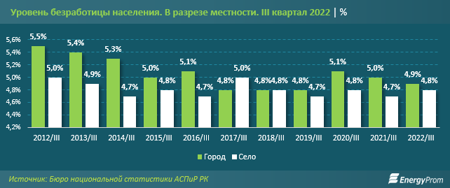 Уровень безработицы в городах РК выше, чем в сёлах: 4,9% против 4,8%. При этом по сравнению с предыдущим годом уровень безработицы в городах сократился, а в сёлах — наоборот, вырос.