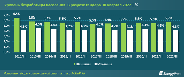 Уровень безработицы в РК за год не изменился, составив в третьем квартале 2022 года 4,9%, при этом в соответствующем периоде 2020-го показатель достигал 5%, а в третьем квартале 2019-го он составлял 4,8%.