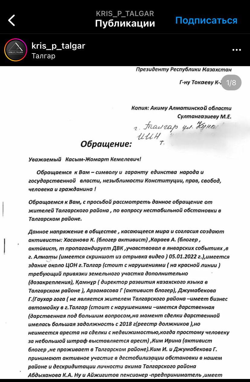Жители Талгарского района Алматинской области написали обращение президенту Казахстана с просьбой защитить акима Кайдара Aбдыханова. По их словам, группа блогеров и активистов дискредитируют действия руководителя района и дестабилизируют обстановку. Об этом сообщает Матрица.kz со ссылкой на Instagram-аккаунт «kris_p_talgar».