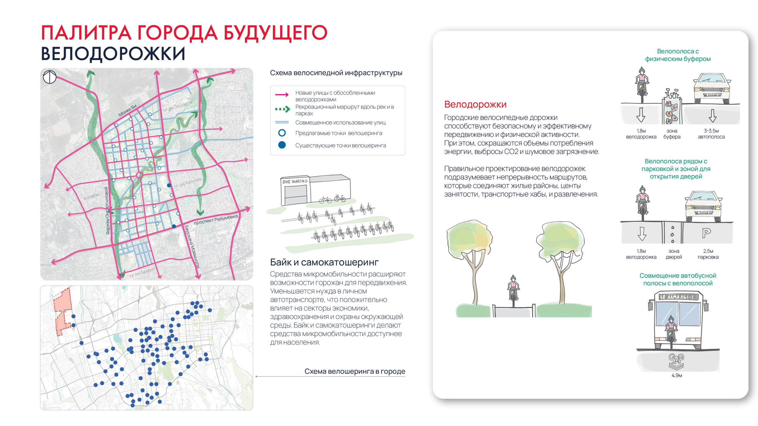 К примеру, INK Architects проектирует такие условия в новом полицентре Алматы – Западных воротах, также предлагая маршруты и остановки общественного транспорта в шаговой доступности. В районах города будущего поколения планируются велоинфраструктура, небольшие круговые движения на перекрестках, которые позволят избежать светофоров и простоев, и в то же время увеличивают безопасность проезда.