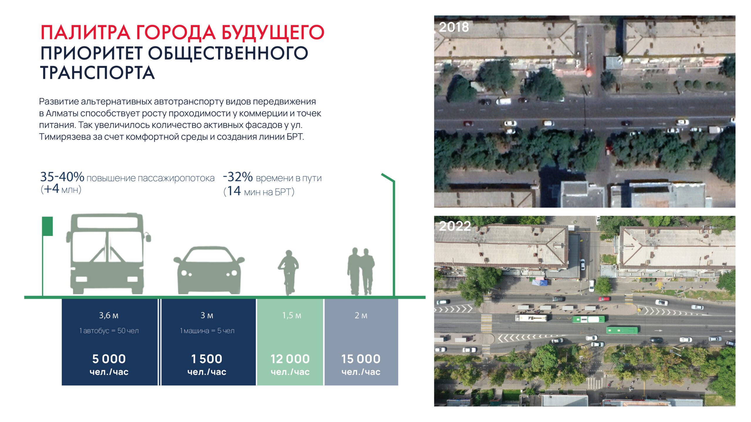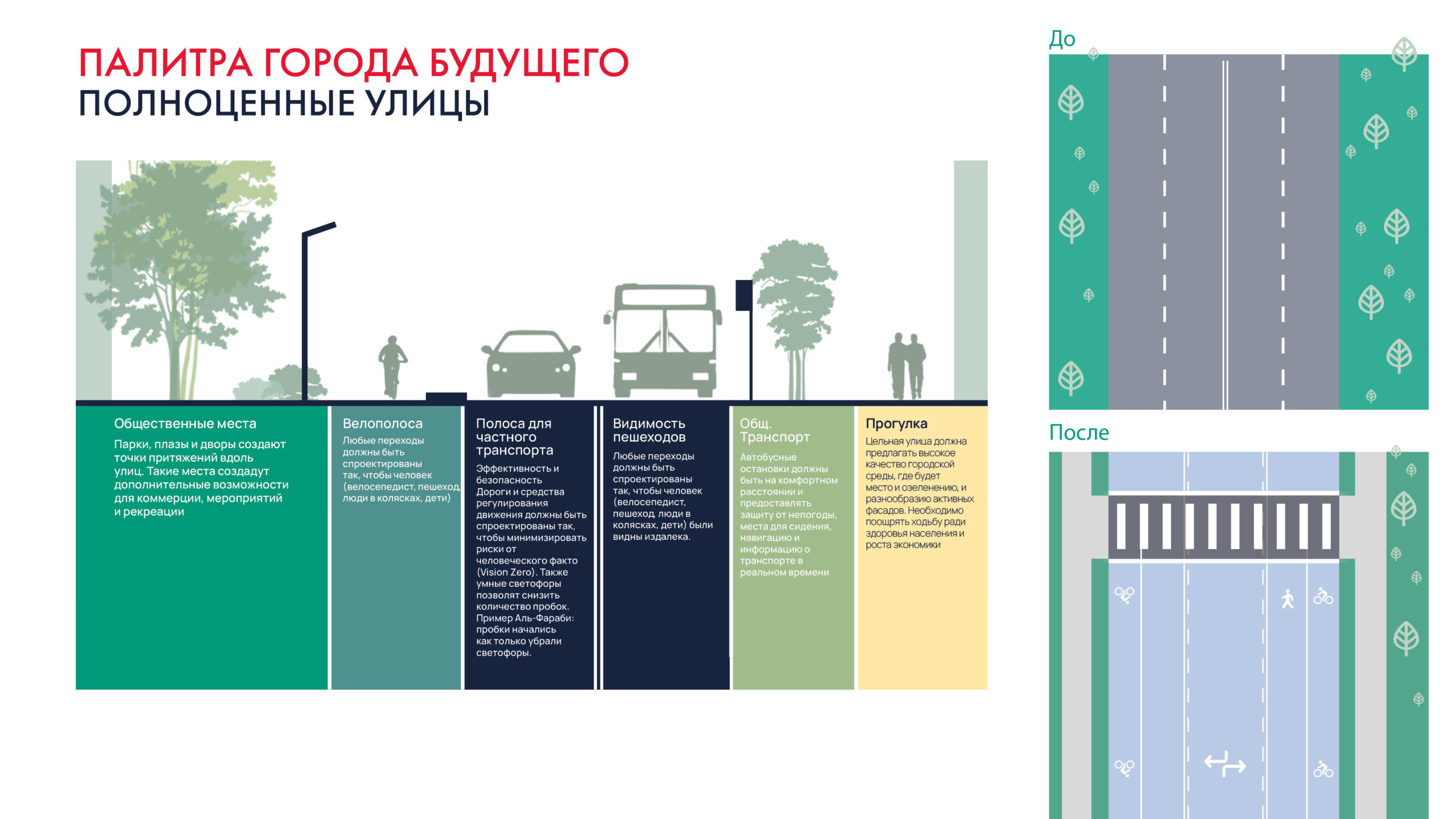 «Продуманная уличная среда может регулировать скорость автотранспорта, самокатов и велосипедов, увеличивать комфорт и безопасность пешеходов. Как следствие, повышать рентабельность коммерции, стоимость квартир, стимулировать малый бизнес, предпринимательство вдоль пешеходных потоков. Комфортные, уютные и пешеходные районы имеют повышенную стоимость в сравнении с районами, ориентированными на автомобилистов», — сказал Нурлан Камитов.