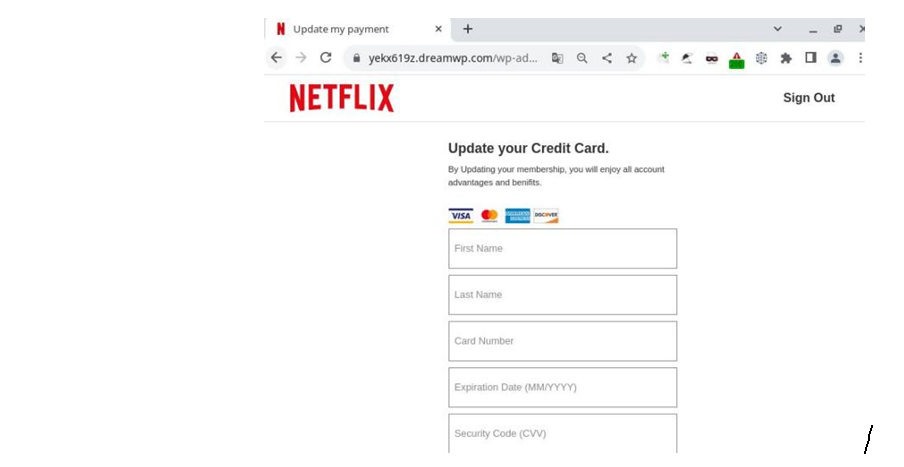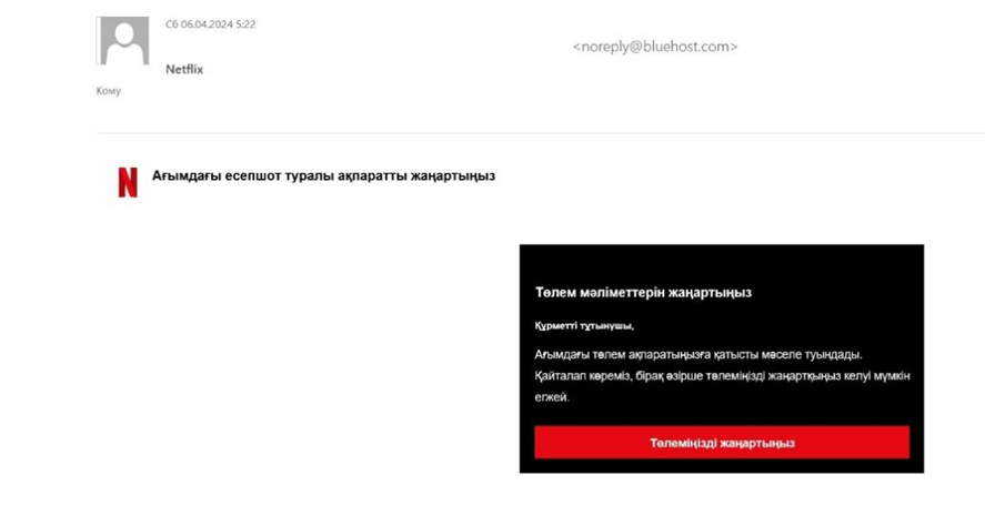 «Касперский зертханасының» сарапшылары қазақ тіліне белгілі скам-таратылымның жергіліктендірілген түрін анықтады. Пайдаланушыға Netflix-тен төлем деректерімен кедергілер туралы ескерту келеді. Сілтемемен өткенде жәбірленуші стримингтік қызметтің жалған сайтына түседі, онда оған жазылымды жаңарту және төлем ақпараты бар нысанды толтыру ұсынылады. Бұл ақпараттық таратылымның айырмашылығы, әдетте, алаяқтар ресурстың негізгі мақсатты аудиториясына назар аудара отырып, ағылшын тілінде осындай хабарламаларды таратады. Белгілі бір аймақ үшін жергіліктендіру бірінші рет кездесті.