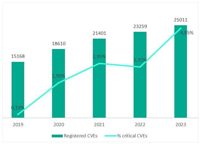 2023 жылы 2019-2022 жылдардағы орташа жылдық көрсеткішпен (413)**салыстырғанда үш есе көп сыни осалдықтар (1213) тіркелді.