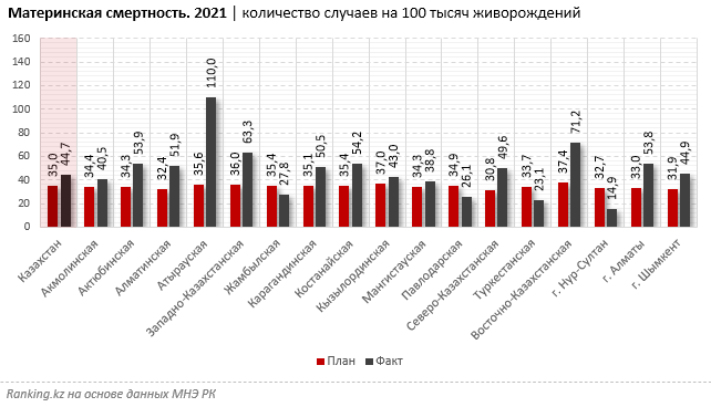 По факту же уровень материнской смертности в 2021 году составил 44,71 на 100 тыс. живорождений, то есть остался недостигнутым даже сильно завышенный для 2021-го по сравнению с планом Минздрава показатель. Нацплан в этой сфере провалили почти все регионы страны. Более того, в Атырауской области фактический уровень материнской смертности превысил ожидаемый в три раза. Исключение составили Жамбылская, Туркестанская и Павлодарская области, а также Нур-Султан.
