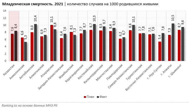 Что касается другого важного показателя Национального плана — детской смертности, — здесь показатели не были достигнуты вообще ни в одном регионе. К концу года детская смертность в Казахстане должна была снизиться до 7,6 на 1000 родившихся живыми по сравнению с 7,77 годом ранее. Однако показатель, наоборот, вырос до 8,44 в среднем по стране.
