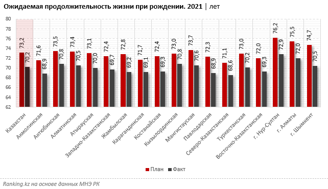 Планировалось, что к концу 2021 года ожидаемая продолжительность жизни при рождении увеличится в среднем по Казахстану до 73,2 года. На деле же показатель упал до 70,2 года, что даже меньше, чем ранее, в 2020-м (71,4 года).