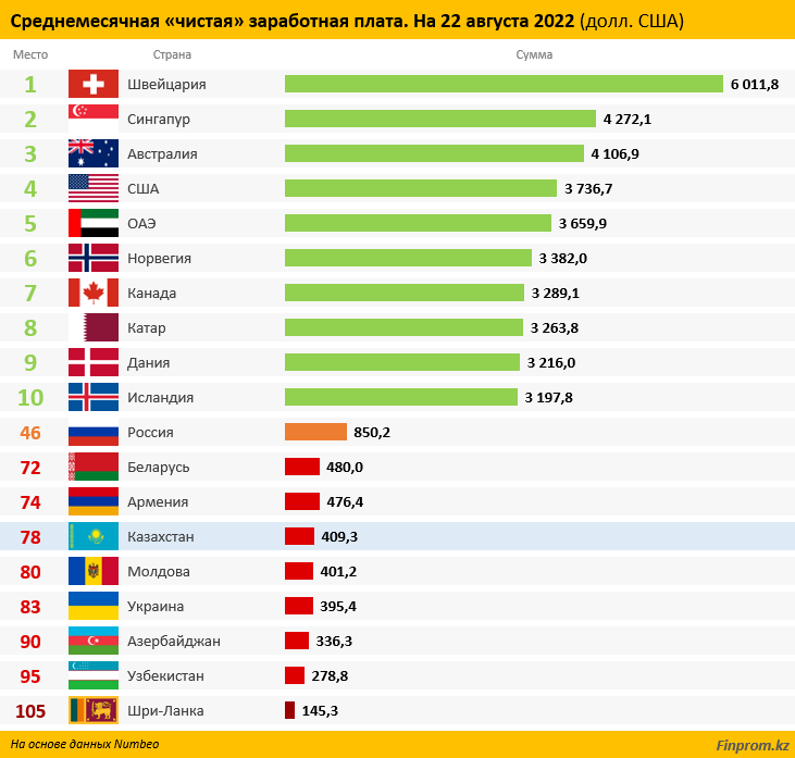 В рейтинге стран по «чистой» заработной плате Казахстан оказался лишь на 78-м месте из 105. Это хуже, чем в России, Беларуси и Армении, передаёт Матрица.kz со ссылкой на Finprom.kz.