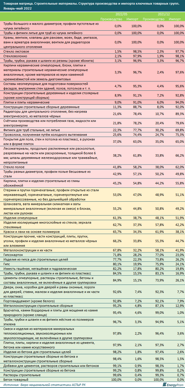 О том, что Казахстан находится в серьёзной зависимости от импорта стройматериалов, писали уже не раз. Для примера: по итогам пяти месяцев текущего года импорт не просто перевешивает объёмы отечественной продукции, но и обеспечивает сразу более 90% имеющихся ресурсов в таких ключевых товарных категориях, как строительные деревянные конструкции, составы для подготовки фасадов, резиновые трубы и шланги, листовое стекло и стекловолокно, керамические огнеупорные кирпичи и плиты, трубы, профили и фитинги из чугуна, краны, клапаны и вентили для сантехники и радиаторов, сообщает аналитическая служба EnergyProm.