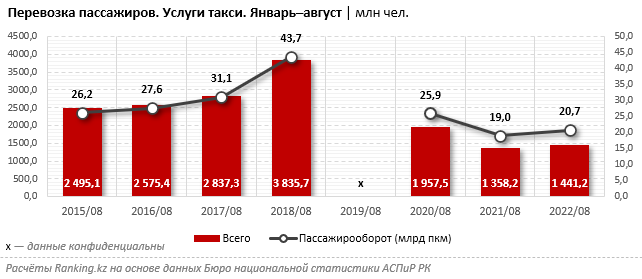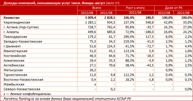 За январь–август текущего года доходы компаний, оказывающих в Казахстане услуги такси, составили 3 млрд тг, против 2,8 млрд тг годом ранее (плюс 6,4% в денежном выражении).