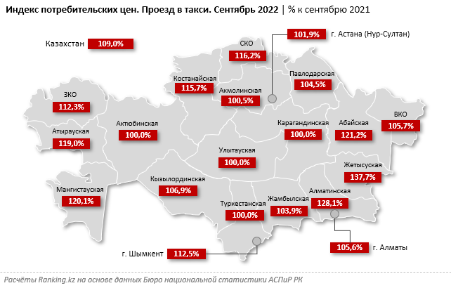 В РК стоимость услуг такси в расчете на 1 км составила 0,32 долл. США. Казахстан оказался на 12-м месте по дешевизне услуг такси из 105. Среди стран СНГ дороже, чем в РК, услуги такси обходятся в Азербайджане и России, дешевле — в Беларуси, Узбекистане, Молдове, Украине* и Армении.