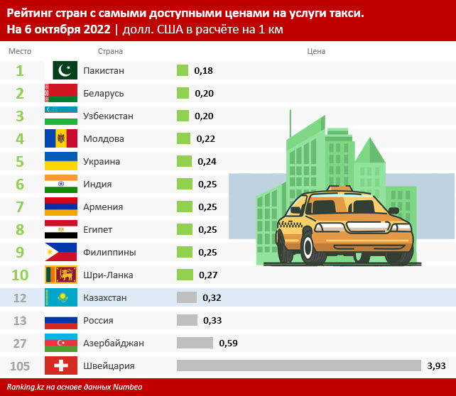 Согласно данным Numbeo, самая низкая цена на услуги такси в расчёте на 1 км по состоянию на 6 октября текущего года была зафиксирована в Пакистане (0,18 долл. США), а самая высокая — в Швейцарии (3,93 долл. США). Об этом сообщает Матрица.kz со ссылкой на ranking.kz.