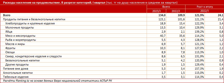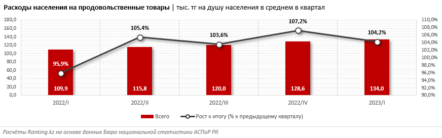 Обнародованная международными аналитиками сумма расходов казахстанцев в два раза превышает цифры, которые указывает национальная служба статистики. Судя по отчётам Бюро национальной статистики АСПиР РК, в январе–марте текущего года затраты жителей на продукты составляли 134 тыс. тг в квартал, или 44,7 тыс. тг в месяц. В сравнении с первыми тремя месяцами прошлого года казахстанцы стали тратить на эту обязательную статью на 21,9% больше. Рост был постепенным, по 4%–7% в квартал, но в итоге разница оказалась существенной.