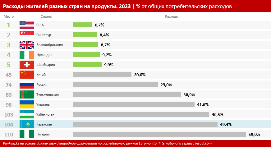 Казахстан занял 104-е место в мире в рейтинге по затратам жителей на продукты питания и вошёл в число мировых антилидеров по этому показателю. Всего сравнение проводили по данным из 110 государств, передает аналитическая служба Ranking. Судя по расчётам аналитиков международной компании по исследованию рынков Euromonitor International и сервиса Picodi.com, почти половину (49,4%) потребительских расходов казахстанцев составляет покупка еды. В сравнении с развитыми странами это очень много. Например, в США доля затрат на продовольствие составляет всего 6,7%, в большинстве европейских странах показатель колеблется в пределах 9%–19%. Даже в некоторых бедных странах Африки траты жителей на продовольствие меньше, чем у казахстанцев: в Уганде — 44,2%, в Камеруне — 45,2%, в Эфиопии — 41,3%.