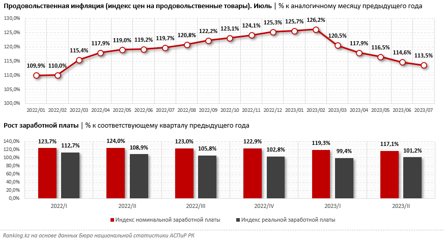Второй фактор связан с тем, что рост доходов казахстанцев не успевал компенсировать взлетающие цены на продукты. Это хорошо видно по разнице в динамике номинальной и реальной зарплат. Например, в первом квартале текущего года средняя номинальная зарплата казахстанцев выросла на 19,3%, а её покупательная способность уменьшилась на 0,6%. В апреле–июне индекс реальной зарплаты был хоть и в плюсе, но этот плюс был настолько крошечным (1,2%), что, думается, казахстанцы его вряд ли заметили.