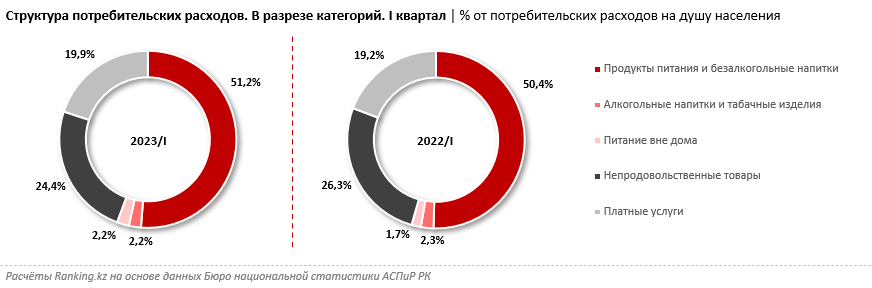 Согласно данным БНС АСПиР РК, доля затрат на продуктовую корзину за последний год увеличилась с 50,4% в первом квартале прошлого года до 51,2% в январе–марте текущего года. Незначительное отличие от данных Euromonitor International (49,4% в августе) объясняется как разными рассматриваемыми периодами, так и возможной разницей в методиках.