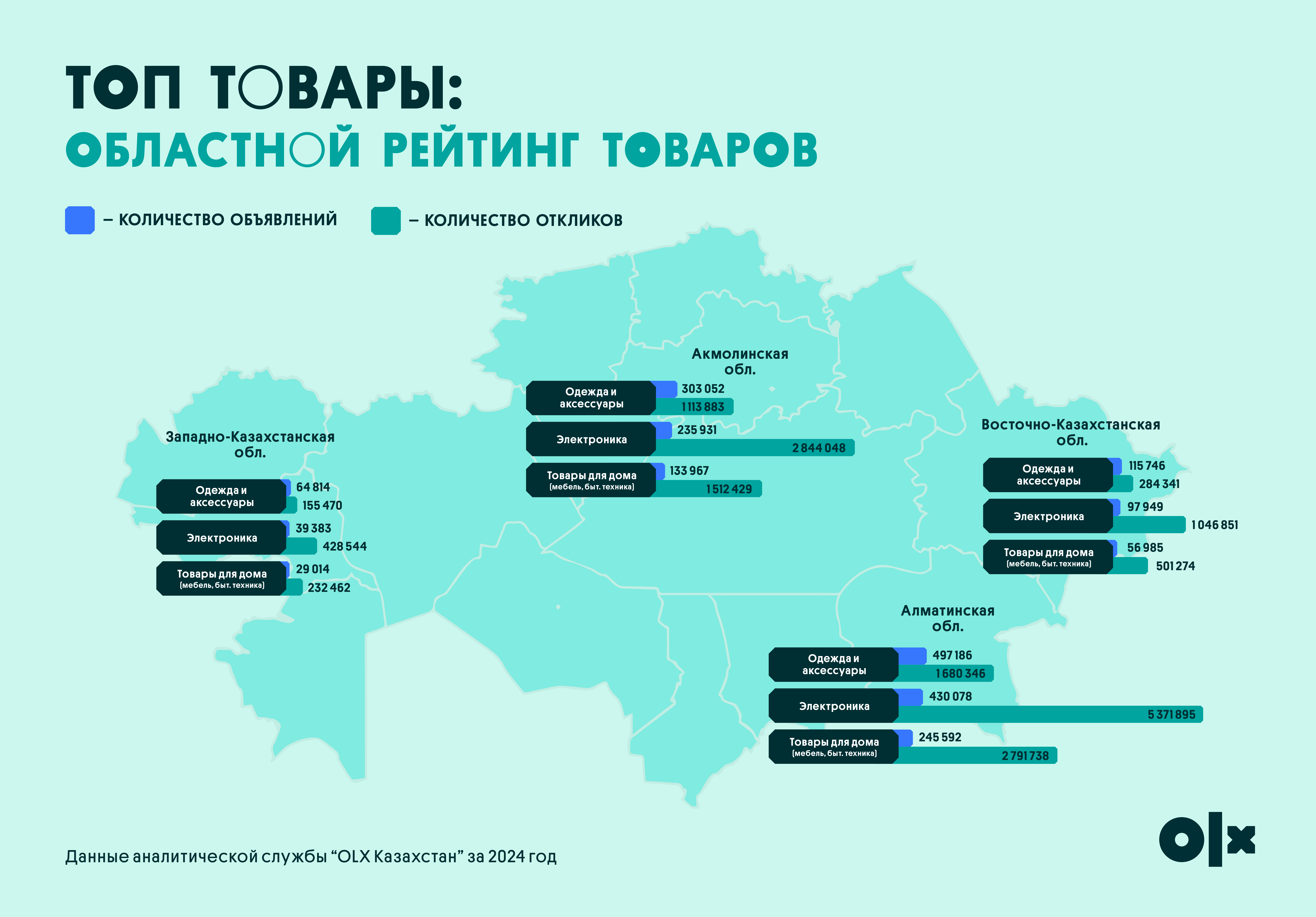 Так, в Алматинской области на 2024 год количество объявлений категории “Одежда и аксессуары” достигло 497 186, а количество откликов — 1 680 346, в Акмолинской области — 303 052 с количеством просмотров 1 113 883, в Западно-Казахстанской области же — 64 814 с количеством просмотров 155 470.