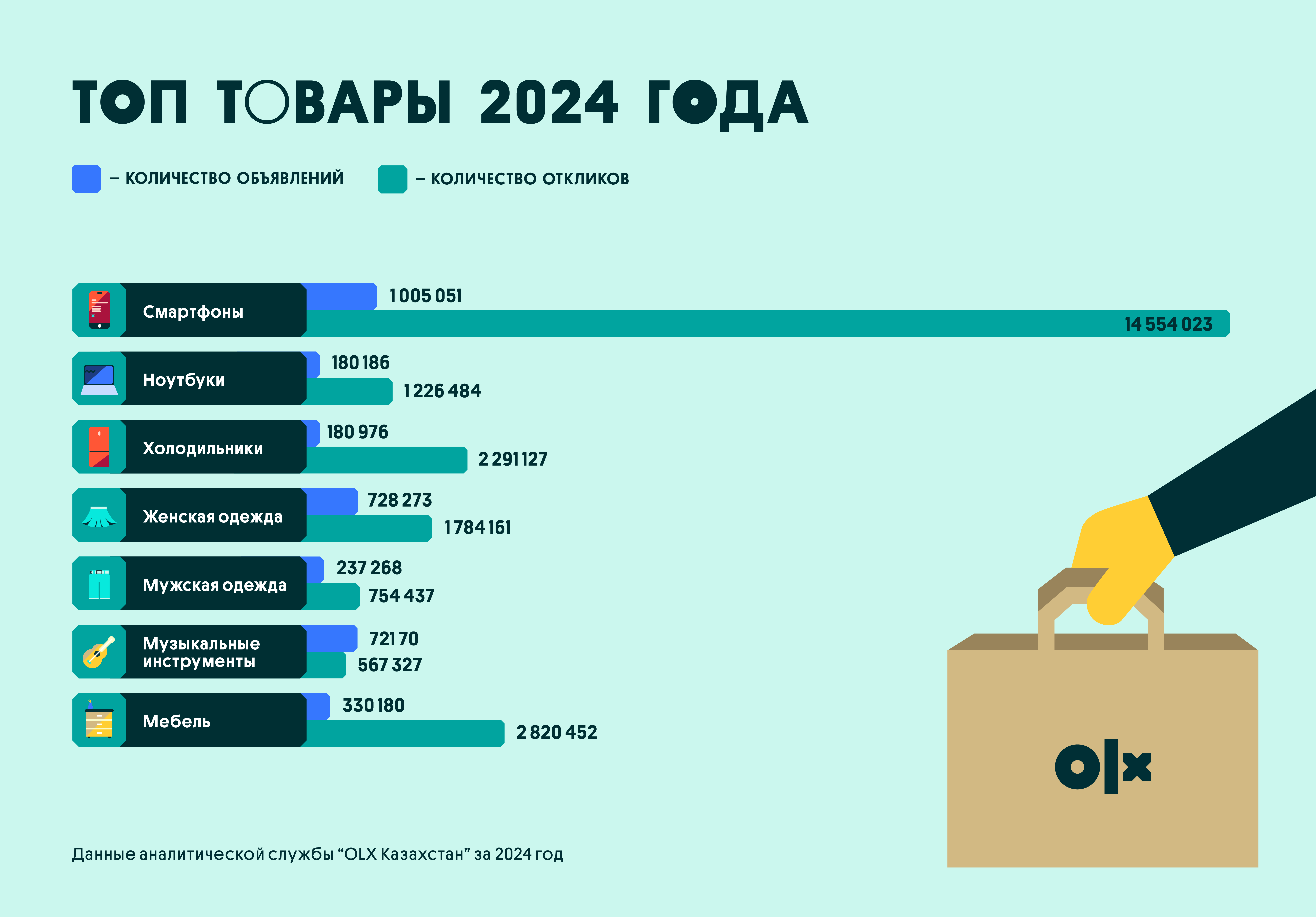 В сравнении с предыдущим, 2023 годом, в котором казахстанцы чаще всего покупали на маркетплейсах товары для дома, одежду и обувь, в 2024 году, согласно данным аналитической службы OLX Казахстан, по числу просмотров, количеству откликов и продаж лидируют такие категории, как смартфоны, ноутбуки, бытовая техника, игровые приставки и комплектующие, а также товары, относящиеся к категории мода и красота.