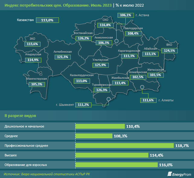 В региональном разрезе наибольшее удорожание было зафиксировано в Туркестанской области: на 26,3%. В тройке антилидеров также оказались Костанайская (на 26,2%) и Улытауская (на 25,9%) области. Наименьшее удорожание в секторе наблюдалось в Жетысуской области: всего на 1,5%.