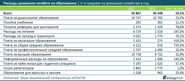 В 2022 году домохозяйства РК, по официальным данным, потратили на образование в среднем 60,9 тыс. тг — сразу на 50,5% больше, чем годом ранее.
