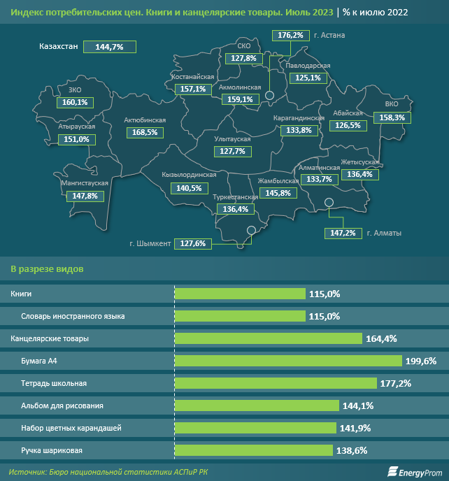 В региональном разрезе наибольший рост цен на книги и канцелярские товары был отмечен в столице: на 76,2% за год. Заметное удорожание также зафиксировали в Актюбинской (на 68,5%), Западно-Казахстанской (на 60,1%), Акмолинской (на 59,1%) и Восточно-Казахстанской (на 58,3%) областях.