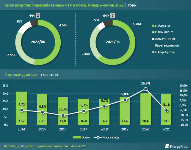 Для справки: в 2021 году объём производства чая и кофе составлял 19,6 тыс. тонн — на 5,1% меньше, чем в предыдущем году.